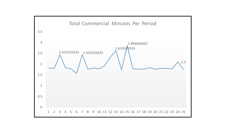 Below is the tabulation I performed. The game is divided in 25 periods. This corresponds to when I started my timer for commercials. So, there were 25 commercial periods during the entire game. The one extra period would be the ending part of the game, so there are 24 periods which can be divided into roughly 4 quarters of 6 minutes.